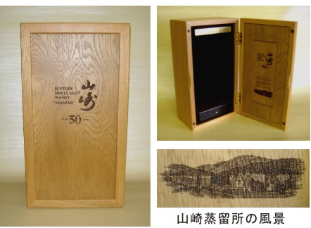 まだ記憶に新しいと思いますが、テレビや新聞でも話題になった“サントリー山崎50年”記念ボトル(価格100万円)50本限定の特製木箱。